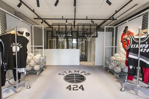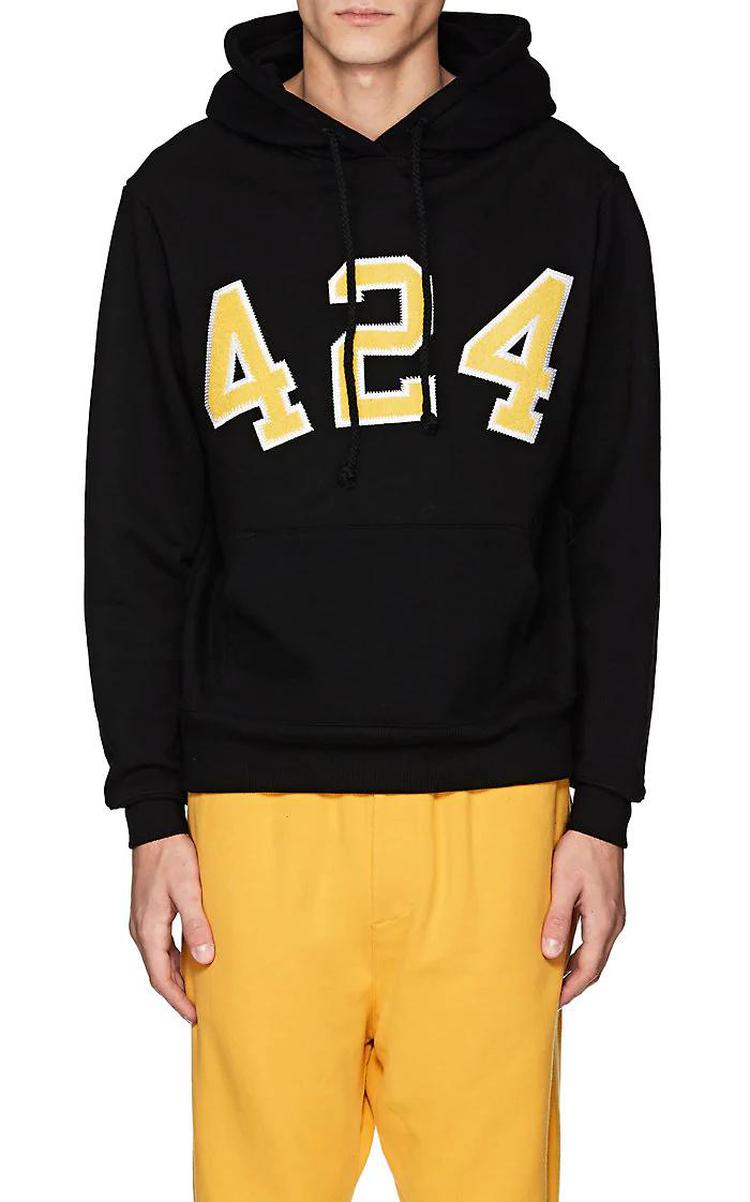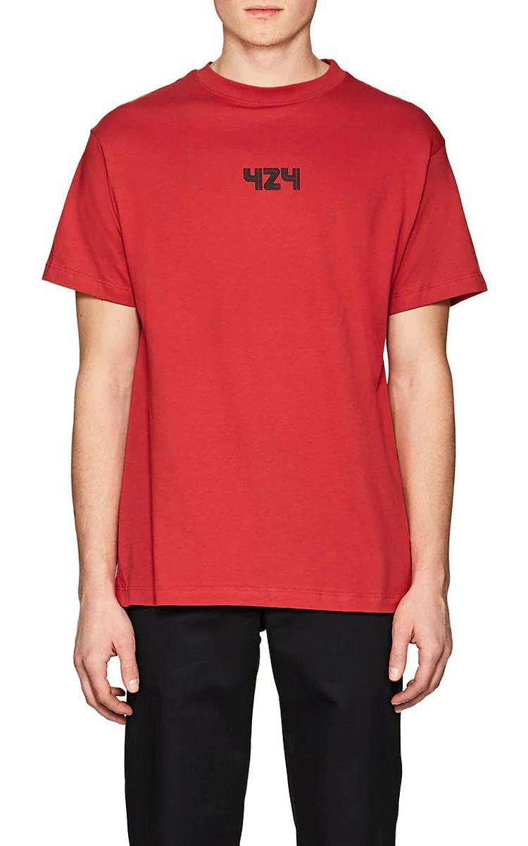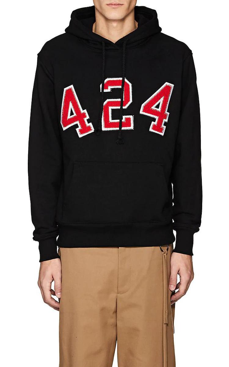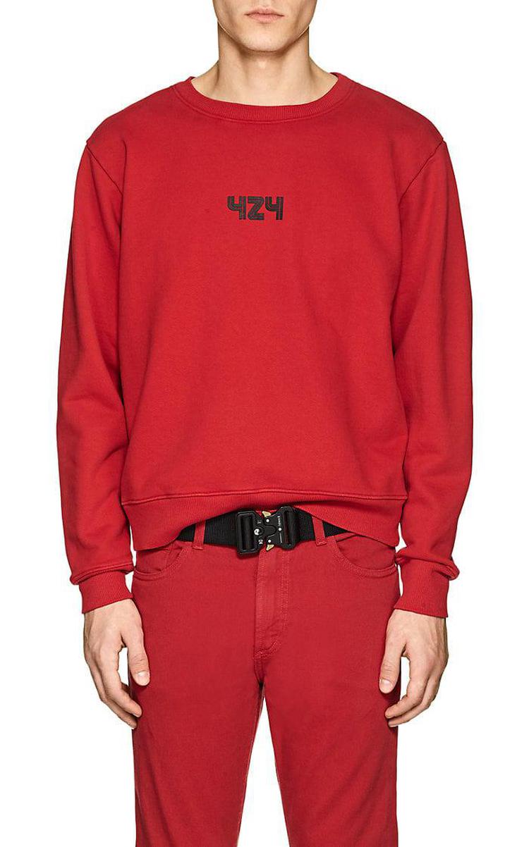 424擅长运用品牌Logo变化及手工染制破坏单宁,基本上在中国有嘻哈中每位Rapper都有一件424,此品牌超具代表性的就是红袖标牛仔外套,第一次见到还以为是哪来的巡逻队。但424不因此而满足,在2018年还与LA潮牌Stampd和艺术家Sean from Texas联名举办活动,把店里营造的像篮球场及艺廊一样。
