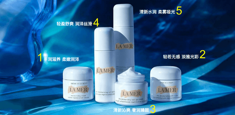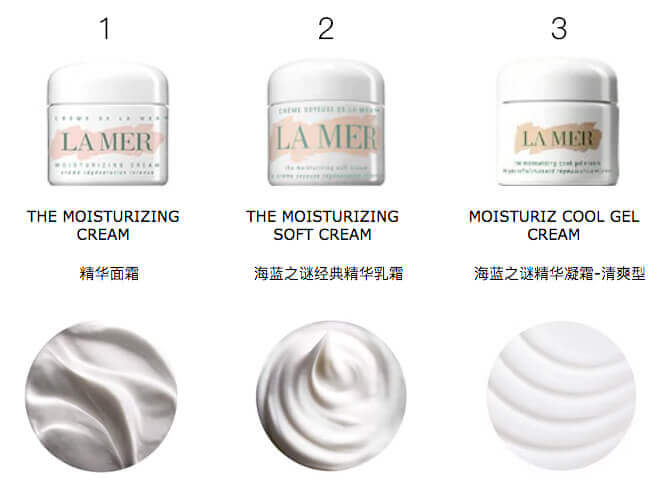 1️⃣精华面霜(Crème de la Mer)经典,需乳化的版本,适合极干&干性肌肤。2️⃣精华乳霜(The Moisturizing Soft Cream)经典乳霜的不需乳化版本,适合混合&干性肌肤。3️⃣精华凝霜(The Moisturizing Cool Gel Cream)沁凉水润凝霜质地,适合混合&油性肌肤。