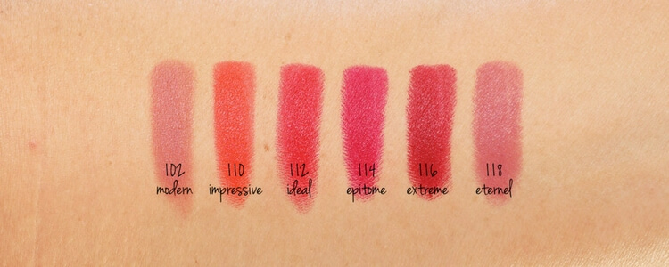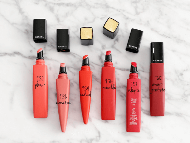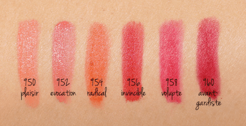 • 950 Plaisir 柔和杏裸色 • 952 Evocation 浅玫瑰粉色 • 954 Radical 亮橘红色 • 956 Invincible 正红色 • 958 Volupte 莓果粉色 • 960 Avant-Gardiste 酒红色